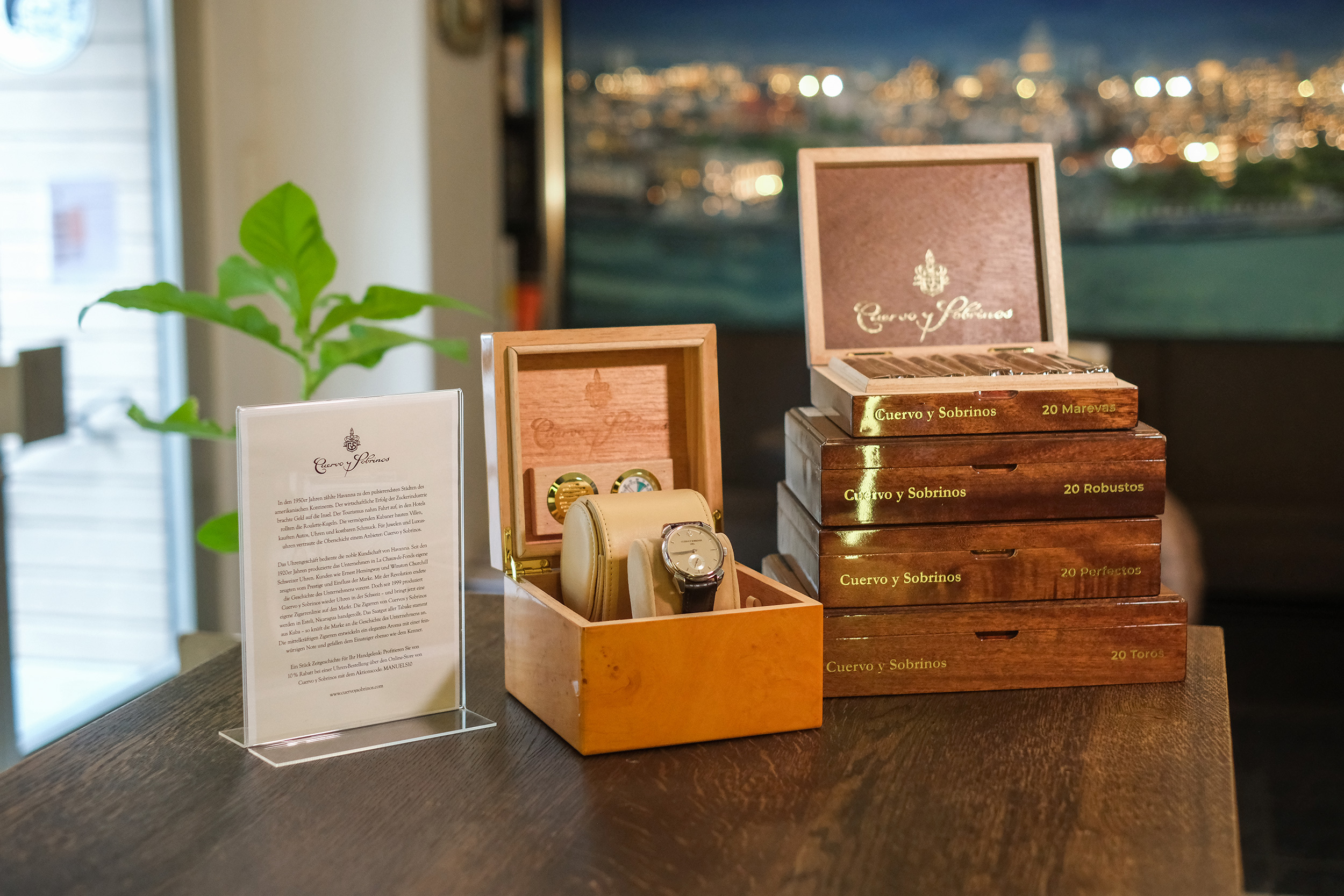 Mit einer «Cuervo y Sobrinos»-Uhr trägt der Geniesser ein Stück Zeitgeschichte am Handgelenk. Ausgewählte Zigarren-Fachhändler bieten ihren Kunden jetzt die Möglichkeit, die Uhren in Natura zu bestaunen und anzuprobieren. Jede Uhr wird in einer Holzschatulle ausgeliefert, die sich später als Humidor nützen lässt. Als kleines Extra bieten die teilnehmenden Fachhändler ihren Kunden Spezialkonditionen beim Erwerb einer «Cuervo y Sobrinos»-Uhr über den offiziellen Webstore an.